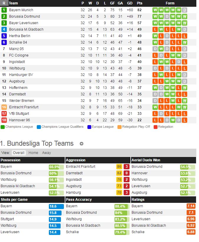 프랑크푸르트는 지난 라운드 다름슈타드 전에서 2-1 승리를 거두고 리그 2연승으로 강등권 탈출에 박차를 가하고 있다. 하지만 프랑크푸르트의 수비진의 짜임새는 그다지 좋지 못한 편이고 상대는 올시즌 리그 팀 득점 1위인 도르트문트이다. 도르트문트는 지난 라운드 볼프스부르크 전에서 5-1 대승을 거두고 우승을 향한 마지막 노력을 다하고 있다. 오바메양은 교체로 후반에 투입되어 2골을 터트리는 등 위협적인 모습을 보여주고 있다.