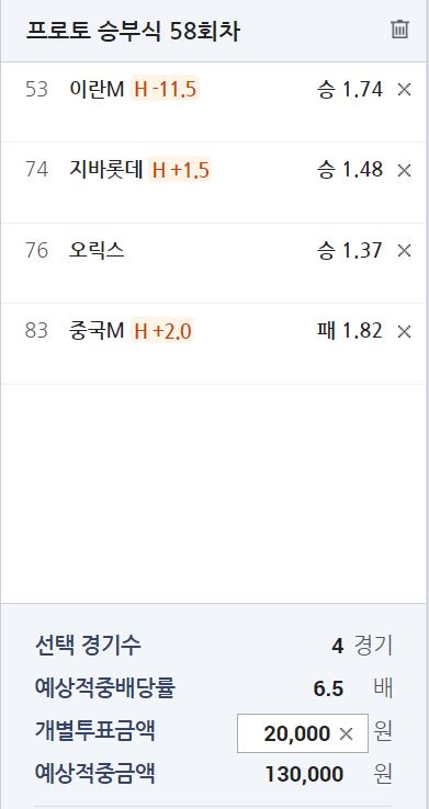 중국 vs 한국 19.50-8.80-1.03 일 때 기록 없음// 프로토 기준 +2.0핸패 기대 확률 48.90% - 적중