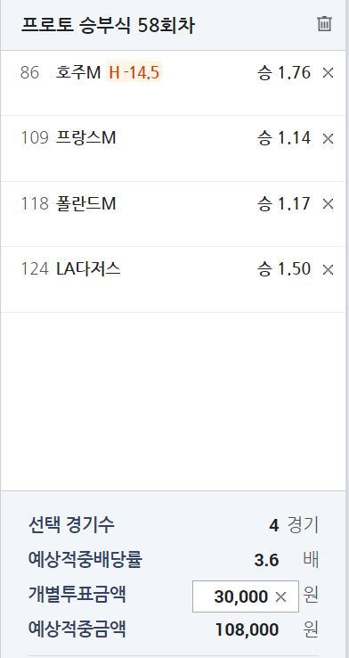 프랑스 vs 일본 1.14-4.06 일 때 3승 1패// 프로토 기준 프랑스 승리 기대 확률 78.07% - 적중