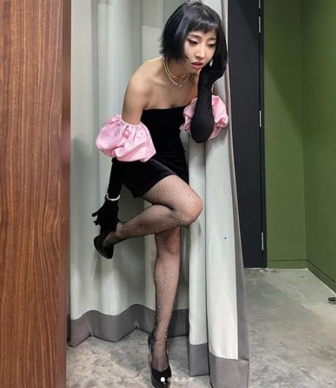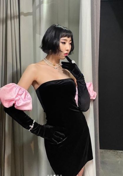 평소 주로 스포티한 힙합, 캐주얼룩을 입던 것과 달리 우아함과 섹시함을 강조한 블랙 미니 드레스다. 진주목걸이까지 착용해 오드리 햅번을 연상하게 한다.