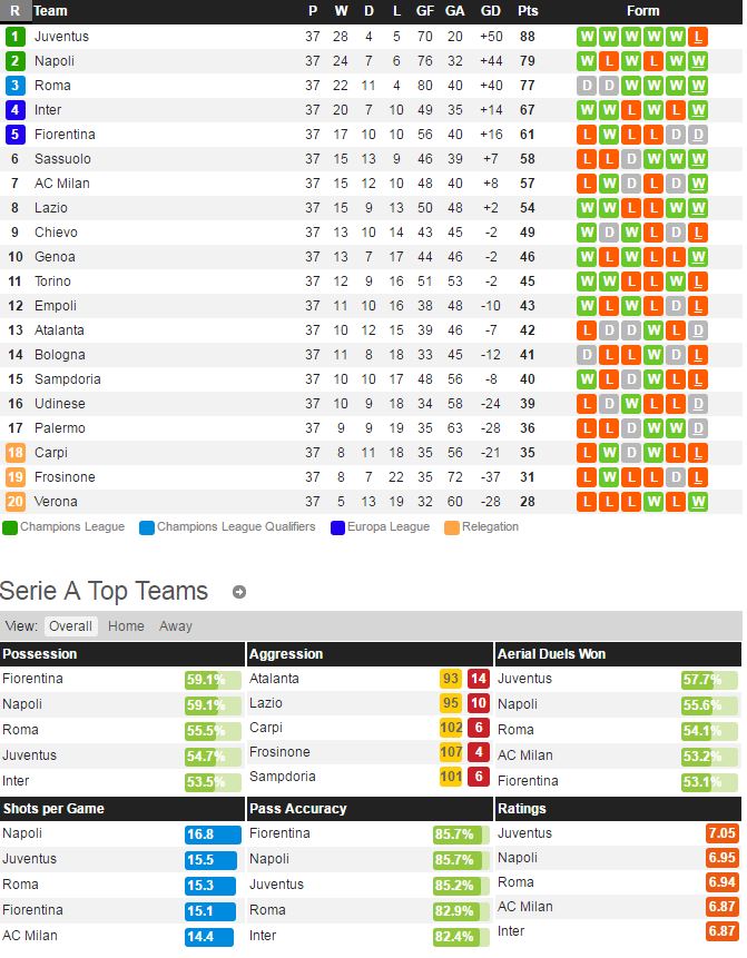 팔레르모는 지난 라운드 피오렌티나 전에서 0-0 무승부를 거두고 리그 17위에 머물러있다. 이번 경기에서 승리를 거둔 다면 자력으로 잔류가 가능한 상황이고 최근 3경기에서 무실점 행진을 이어가는등 경기력이 나쁘지 않다. 베로나는 지난 라운드 유벤투스 전에서 2-1 승리를 거두는 이변을 연출 했다. 비록 강등을 당했지만 끝까지 최선을 다하는 모습이 인상적이었다. 그러나 강한 동기부여가 있는 팔레르모가 좀 더 우세 할 것으로 예상된다.