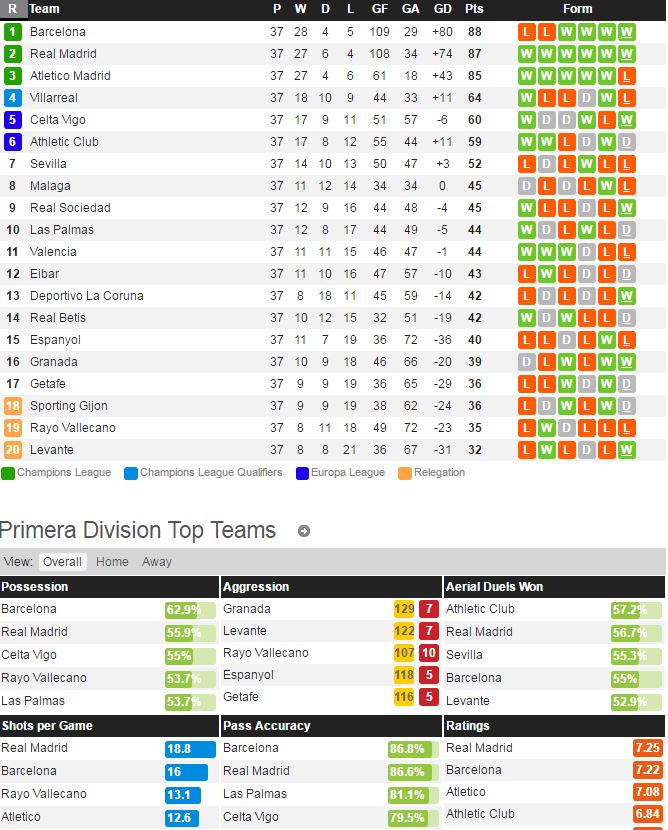 데포르티보는 지난 라운드 비야레알 전에서 2-0 승리를 거두면서 오랜만에 리그에서 승리를 거두었다. 페레즈를 앞세운 역습으로 승리를 노릴 것으로 예상 되지만 상대는 우승 경쟁 중인 레알마드리드이다. 레알마드리드는 지난 라운드 발렌시아 전에서 석연치 않은 판정으로 3-2 승리를 거두었다. 바르셀로나와의 승점 차는 단 1점이기에 이번 경기에 총력전으로 맞설 것이다. 베일을 제외하고 주전 대부분 출전이 가능하고 데포르티보에게도 최근 6전 전승으로 우세에 있다.