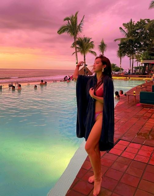 김희정은 인스타그램에 여행 사진 여러 장을 게재했다. 여기서 김희정은 수영장에서 석양이 지는 바닷가를 바라보고 있다.