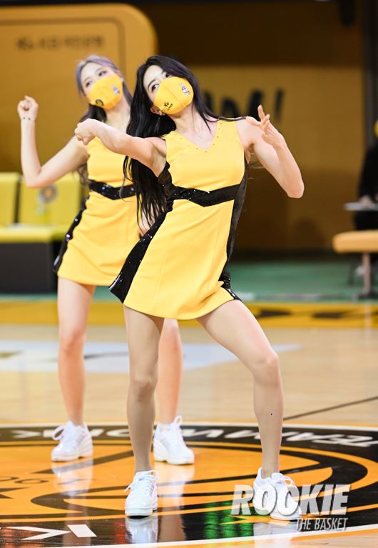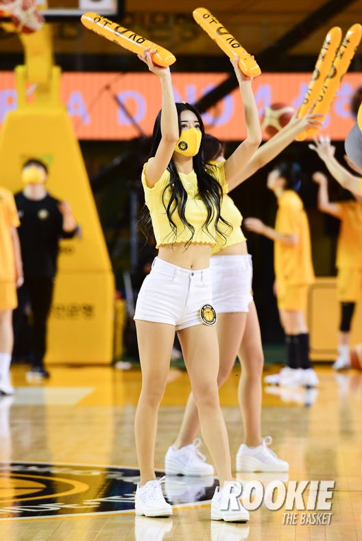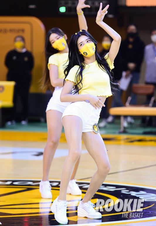청주실내체육관에서 ‘신한은행 SOL 2022~2023 여자프로농구’ 청주 KB스타즈와 아산 우리은행의 경기가 열렸다. 신세희 치어리더가 KB스타즈를 응원하고 있다.