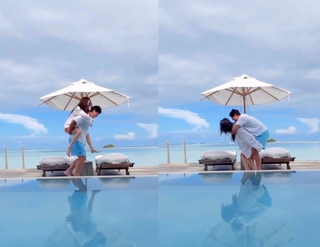 황재균도 인스타그램에 영상으로 애정을 과시했다. 두 사람은 바다가 보이는 몰디브의 한 리조트 수영장에서 춤을 추고 서로 업어주는 장면을 촬영하며 애정을 과시했다.