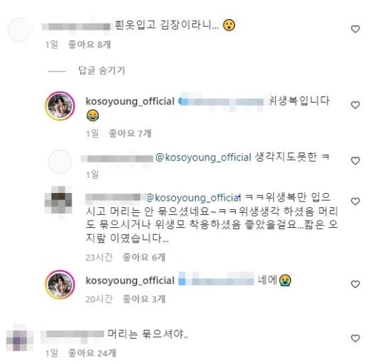 하지만 또 다른 누리꾼이 "위생복만 입으시고 머리는 안 묶으셨네요~위생생각 하셨으면 머리도 묶으시거나 위생모 착용하셨으면 좋았을걸요. 짧은 오지랖이었습니다"라고 꼬집자 고소영은 "네에"라는 글과 함께 우는 이모티콘을 더하며, 쿨하게 대처해 눈길을 사로잡았다.