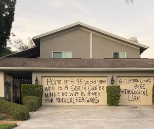사진 속에는 검은색 스프레이로 글씨가 쓰인 한 주택 차고지의 모습이 담겼다. 내용인즉슨 "이 집은 75세의 남성이 사는 곳이다. 그는 아내가 입원해 있는 동안 연속으로 바람을 피웠다"는 것.