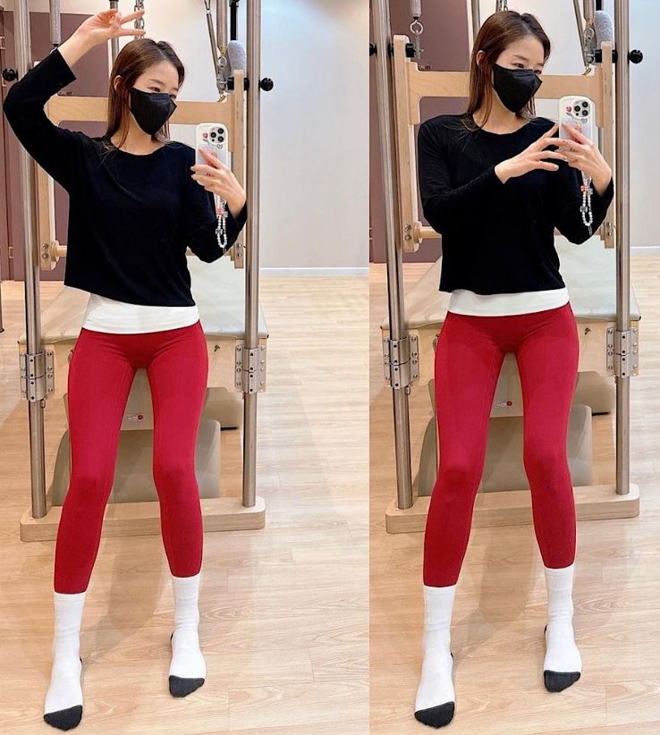 신지는 최근 인스타그램에 “칭찬해”라는 글과 함께 두 장의 사진을 게재했다. 여기서 신지는 강렬한 빨간색의 레깅스를 입고 거울 셀카를 찍고 있다. 필라테스 후 운동 인증샷.