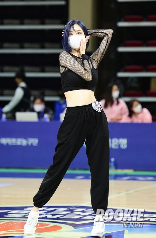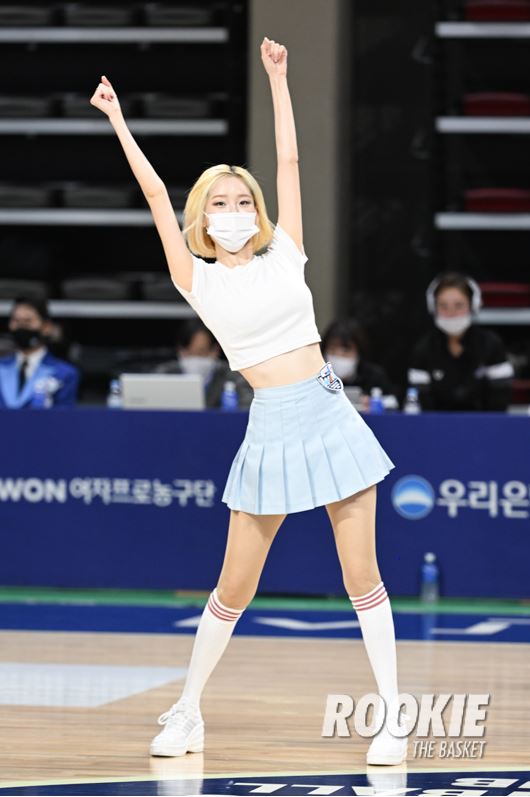 산에 위치한 이순신빙상장체육관에서 ‘신한은행 SOL 2022~2023 여자프로농구’ 아산 우리은행과 용인 삼성생명의 경기가 열렸다. 서현숙 치어리더가 우리은행을 응원하고 있다.