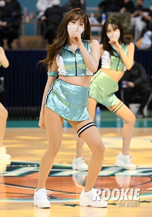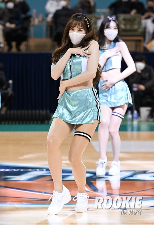 부천실내체육관에서 ‘신한은행 SOL 2022~2023 여자프로농구’ 부천 하나원큐와 청주 KB스타즈의 경기가 열렸다. 김한나 치어리더가 하나원큐를 응원하고 있다.