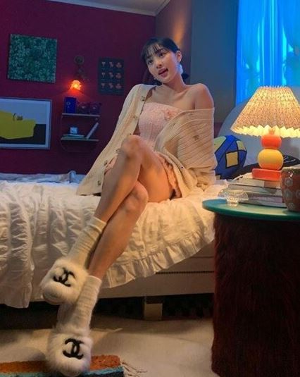 여기서 지효는 침대 위에 앉아 포즈를 취하고 있다. 특히 지효의 청순한 미모와 볼륨 몸매가 시선을 사로잡는다.