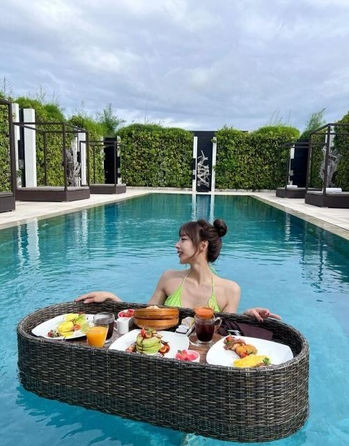 여기서 그녀는 리조트 수영장에서 연두색 비키니를 입은 채 여유를 즐기고 있다. 특히 은지는 완벽한 몸매와 볼륨감 있는 몸매로 시선을 사로잡았다.