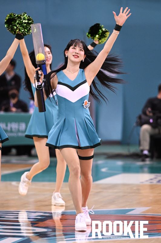 부천실내체육관에서 ‘신한은행 SOL 2022~2023 여자프로농구’ 부천 하나원큐와 아산 우리은행의 경기가 열렸다. 김한나 치어리더가 하나원큐를 응원하고 있다.