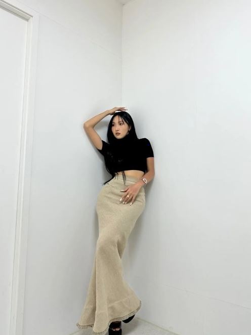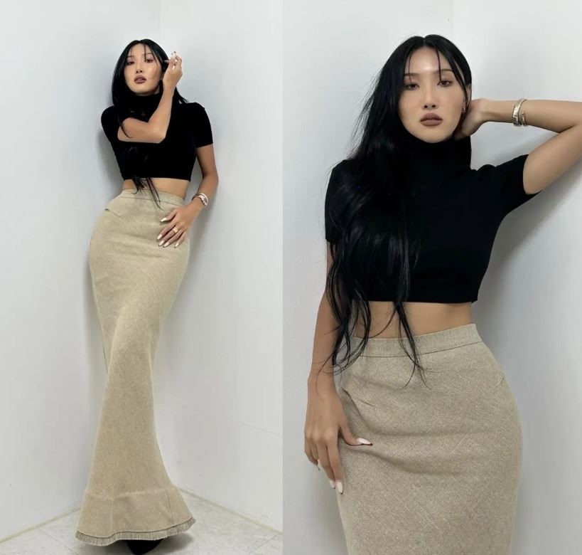 여기에는 화사는 블랙 터틀넥 크롭 티셔츠에 베이지 롱 스커트를 입고, 마치 오르골 위 인형 같은 자태를 선보였다. 특히 그녀는 가녀린 허리 라인과 황금 골반 등 환상적으로 굴곡진 몸매를 자랑해 시선을 사로잡았다.