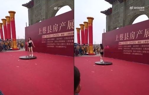 홍콩 사우스차이나모닝포스트(SCMP)에 따르면 지난 10일 중국 허난성 상차이현에서 열린 부동산 박람회 개막식에서 여성 폴댄서의 기념 공연이 펼쳐졌다. 폴댄서는 몸매가 그대로 드러나는 의상을 입고 무대에 올랐다.