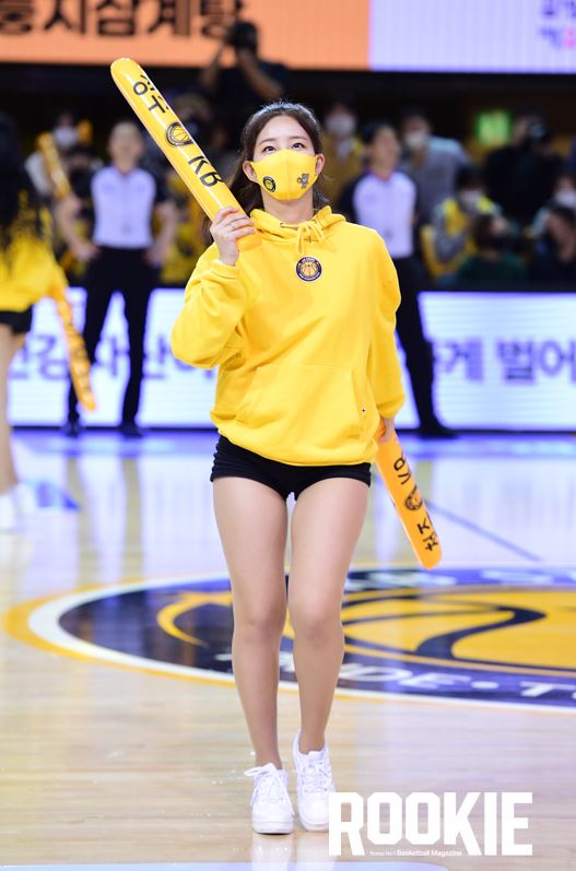 청주실내체육관에서 ‘신한은행 SOL 2022~2023 여자프로농구’ 청주 KB스타즈와 부천 하나원큐의 경기가 열렸다. 김진아 치어리더가 KB스타즈를 응원하고 있다.