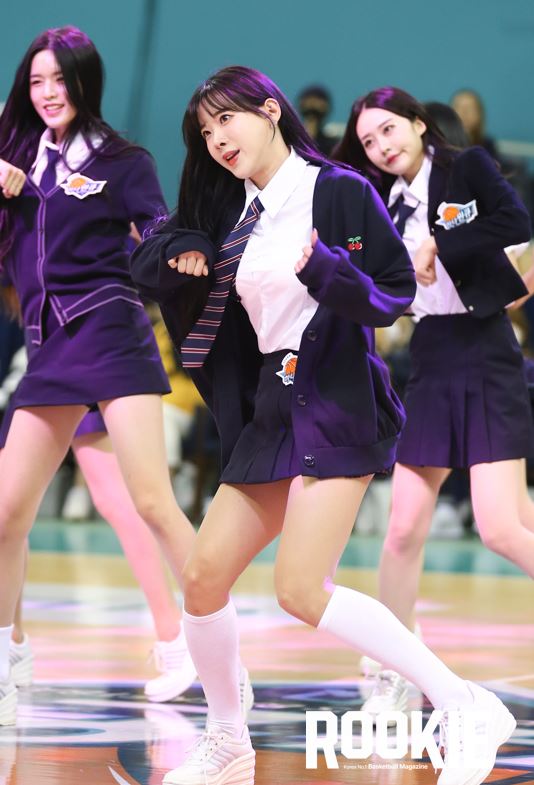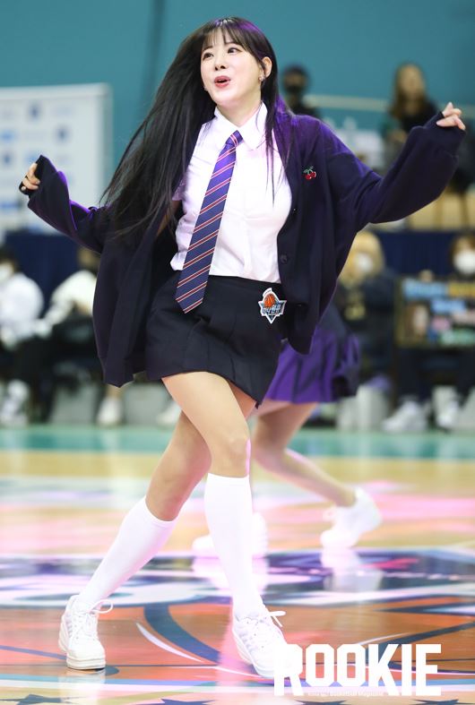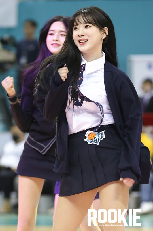 부천실내체육관에서 ‘신한은행 SOL 2022~2023 여자프로농구’ 부천 하나원큐와 청주 KB스타즈의 경기가 열렸다. 김한나 치어리더가 하나원큐를 응원하고 있다.