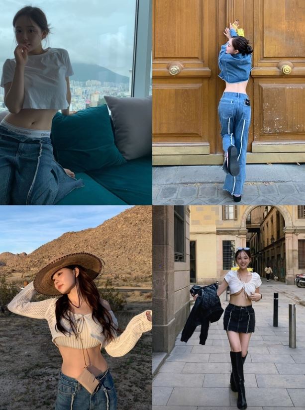 홍영기는 최근 인스타그램 스토리에 스페인 여행 사진을 다수 올렸다. 여기서 그녀는 다양한 크롭톱 패션을 다양한 포즈로 선보이고 있다.