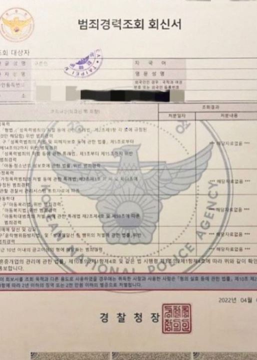 공개된 사진 속에는 구준엽의 범죄경력을 조회하는 서류가 담겼다. 최근 10년 이내 성폭력 범죄 및 가정폭력, 아동학대, 성매매 알선, 금고 이상의 형 등에 모두 해당 자료 없음이라고 표기돼있다.