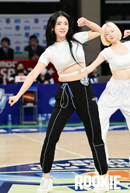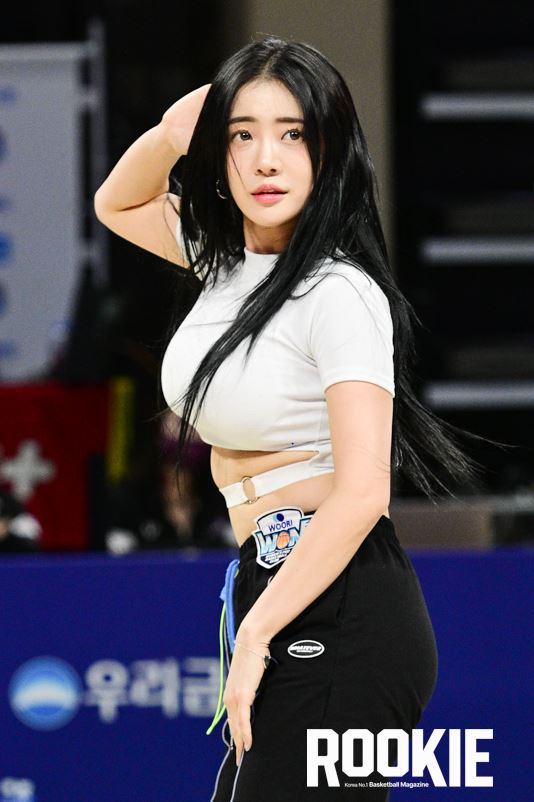 아산에 위치한 이순신빙상장체육관에서 ‘신한은행 SOL 2022~2023 여자프로농구’ 아산 우리은행과 부산 BNK썸의 경기가 열렸다. 이엄지 치어리더가 우리은행을 응원하고 있다.
