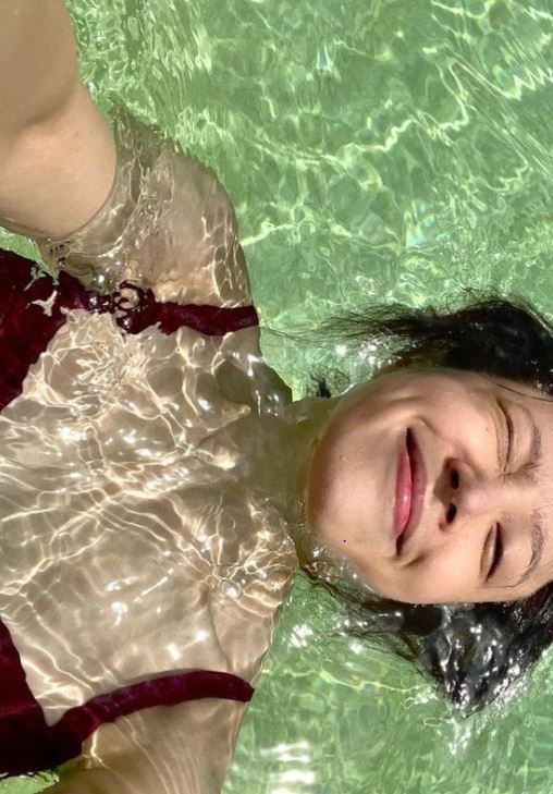 여기에는 하니는 버건디 색상의 비키니를 입고 수영장에서 물장난을 즐기고 있다. 특히 물 위에 얼굴만 띄운 채 셀카를 찍어 유쾌함도 자아냈다.