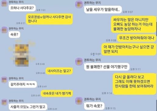 또 B씨는 "선물이 속옷이라서 그렇지. 속옷을 사준다고 하는 거면 다 이상한 거냐. 여자들은 남자 속옷 안 사주냐. 나도 받았는데 그 사람들 이상한 거냐"고 따졌다.