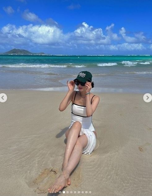 또 다른 사진 속에는 요염하게 앉아 있는 정예인의 모습이 포착됐다. 새하얀 수영복 자태와 함께 탄탄한 몸매를 자랑, 그는 시원한 각선미로 치명적인 매력을 더했다.
