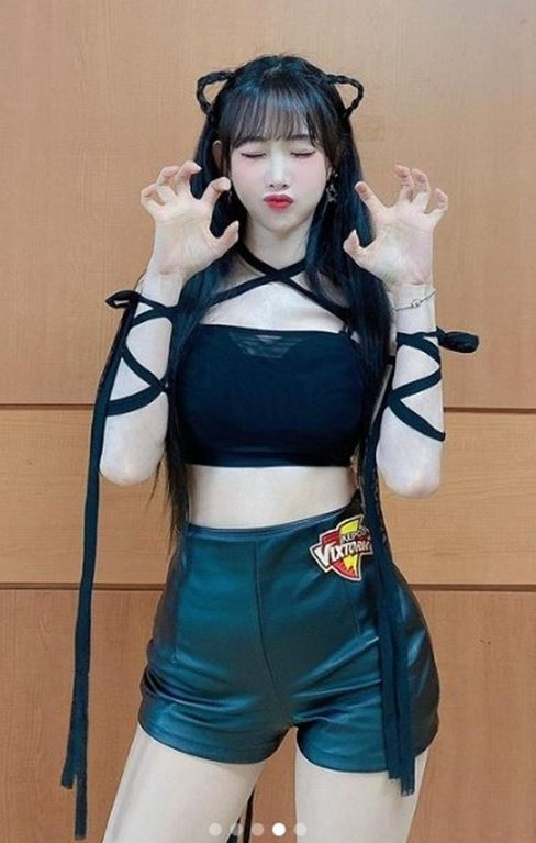 검은 고양이 느낌을 연출한 그는 특유의 청량한 미소로 매력을 과시했다. 특히 탄탄한 허벅지와 안무로 다져진 늘씬한 몸매를 뽐내며 섹시한 분위기를 더했다.