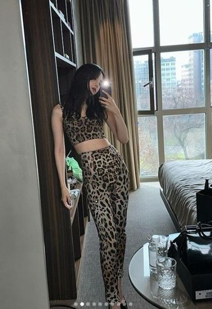또 다른 사진 속에는 호피무늬 레깅스 패션을 소화한 손나은의 모습이 포착됐다. 그녀는 브라톱과 레깅스를 완벽한 핏으로 소화한 채 탄탄한 건강미를 자랑했다.