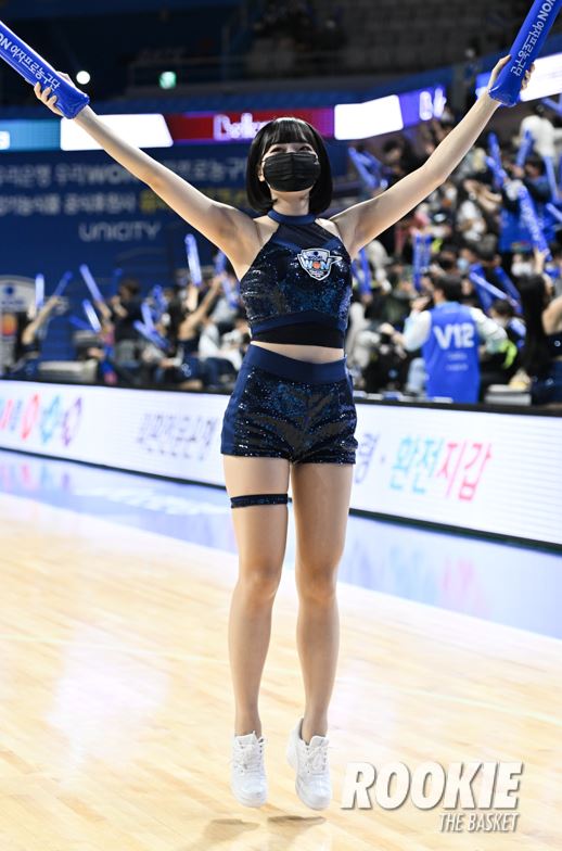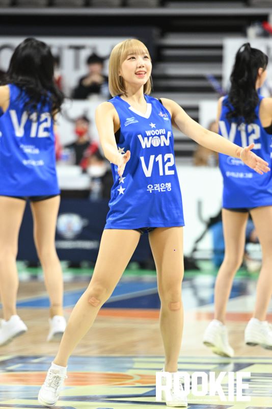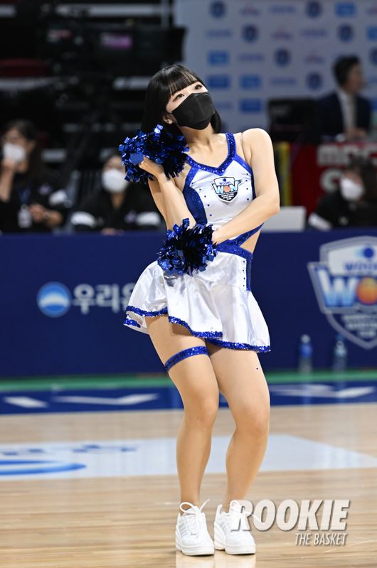 아산에 위치한 이순신빙상장체육관에서 ‘신한은행 SOL 2022~2023 여자프로농구’ 아산 우리은행과 부산 BNK썸의 챔피언결정전 1차전 경기가 열렸다. 박성은 치어리더가 우리은행을 응원하고 있다.