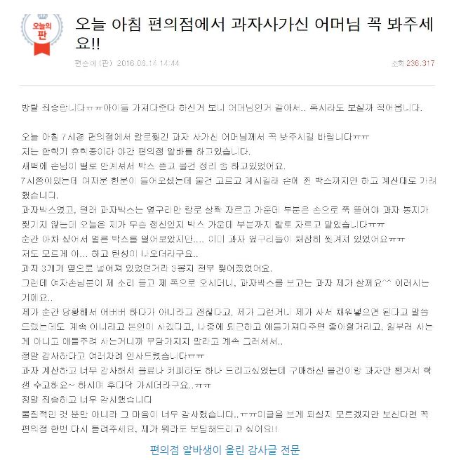 결국 여자 손님은 찢어진 과자를 모두 사갔고 글쓴이는 그 여자 손님에게 감사를 표현하기 위해 대형 온라인 커뮤니티에 '감사글'을 작성했다.