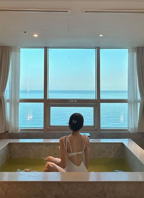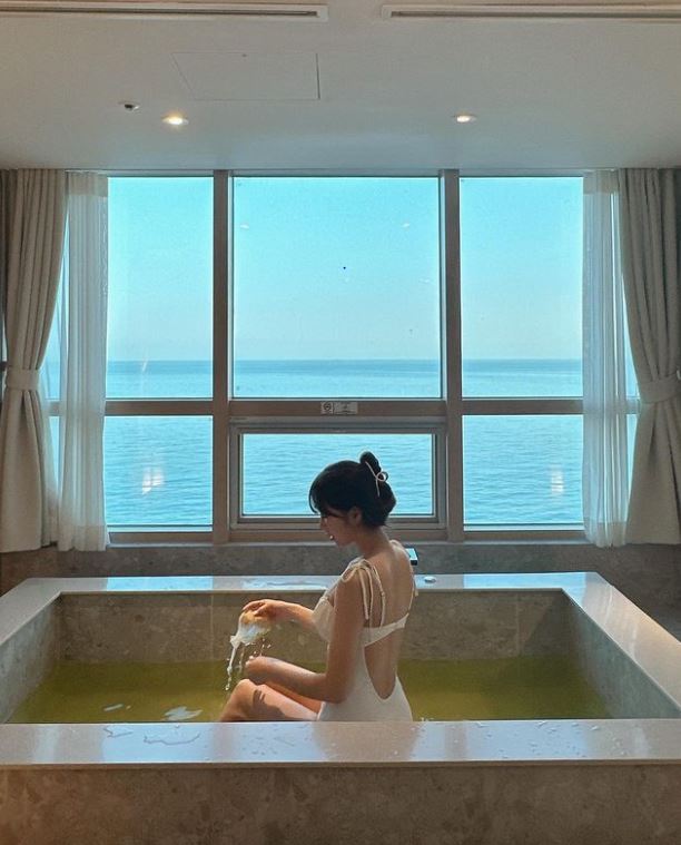 공개한 사진 속 안지현 치어리더는 부산 해운대의 한 스파룸에서 흰색 수영복을 입고 포즈를 취하고 있다. 창문 너머로 멋드러진 부산 앞바다가 펼쳐져 있고 수영복 자태를 뽐낸 안지현 치어리더의 우월한 몸매까지 곁들여져 보는 이들의 감탄을 끌어낸다.