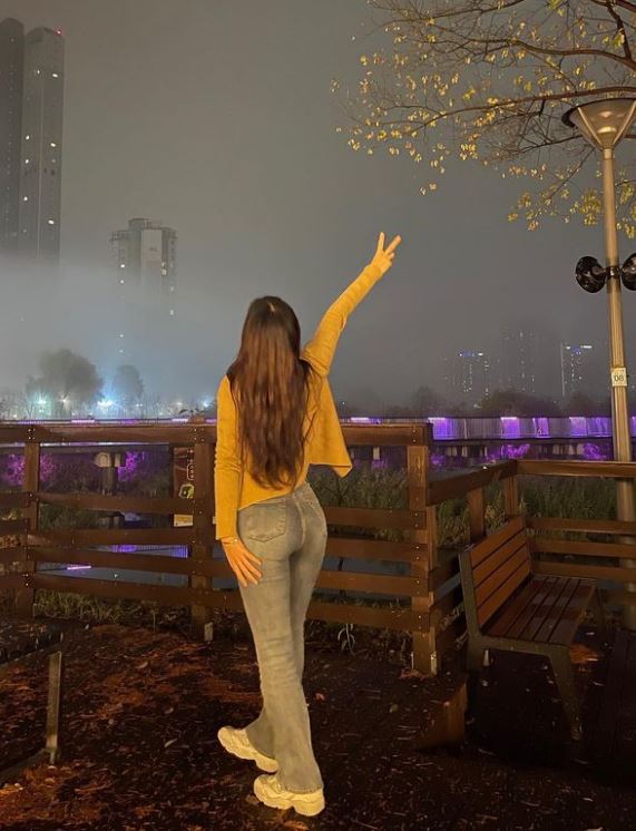 공개한 사진에서 김진아 치어리더는 호수 공원의 야경을 바라보며 오른 손으로 V자 포즈를 취하고 있다. 청바지를 입고 명품 애플힙을 과시하는 등 섹시미도 돋보인다.
