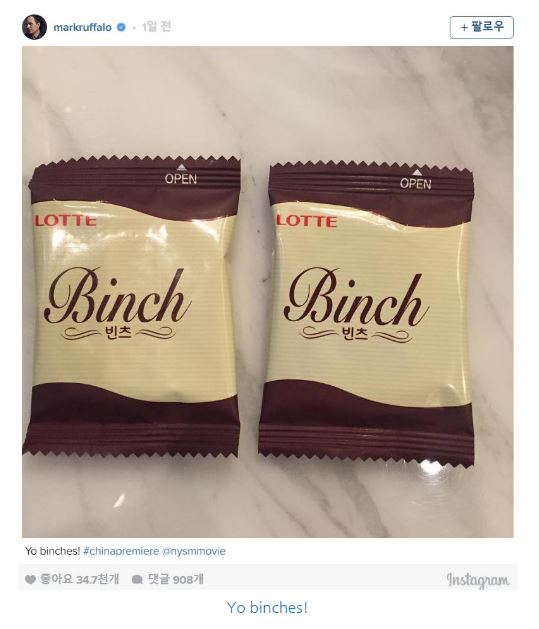 마크 러팔로는 빈츠 사진에 "Yo binches!(와~ 빈츠)"라는 코멘트를 달아 자신이 빈츠를 먹으며 느꼈던 놀라움과 만족감을 드러냈다.