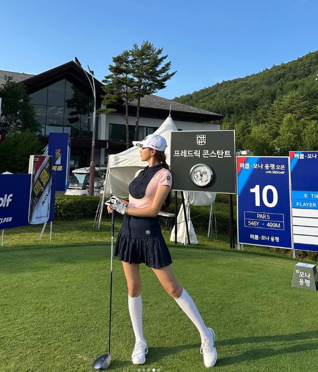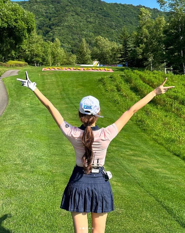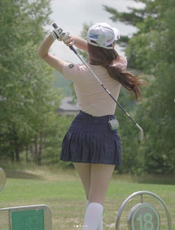 화사한 골프복으로 스타일링한 안지현 치어리더와 용평리조트의 녹색빛이 어우러져 한 폭의 그림을 연상시킨다. 더불어 안지현 치어리더의 비현실적인 신체 비율이 시선을 사로잡는다.