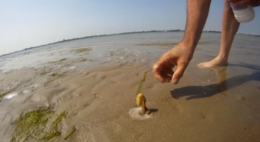 소금샤워를 하고 머리를 내민 이 물체는 'Razor calm'으로 우리나라에선 흔히 '맛조개'라고 불리는 생물이다.