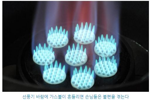 첫번째 이유는 테이블에 있는 불에 영향을 주기 때문이다. 테이블에서 불을 틀어 조리해가면서 먹는 식당의 경우 선풍기를 틀 경우 선풍기 바람이 테이블 불에 영향을 주게 된다. 그렇게 되면 음식이 제대로 가열되지 않거나 아주 늦게 가열되는 문제가 발생하기 때문에 식당 주인들은 선풍기를 눕혀 테이블 불에 바람이 닿지 않도록 한 것이다.