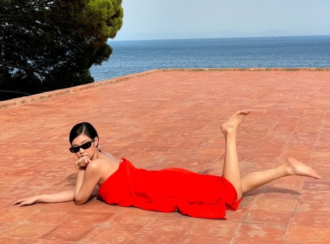 공개된 사진 속에서 제니는 빨간 수건을 연상시키는 파격적인 원피스를 입고 해변에 엎드려 다양한 포즈를 취하고 있다. 특히 그녀의 직각 어깨와 남다른 각선미가 눈길을 사로잡았으며, 얼굴을 거의 다 가리는 큰 선글라스는 제니의 스타일리시한 매력을 한층 더 돋보이게 했다.