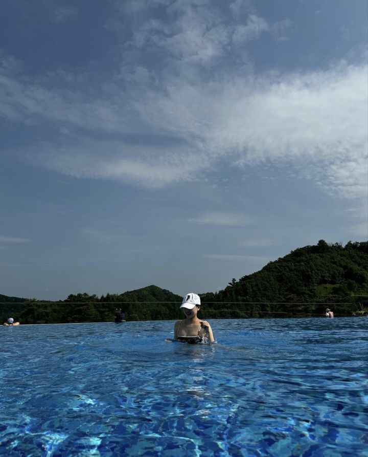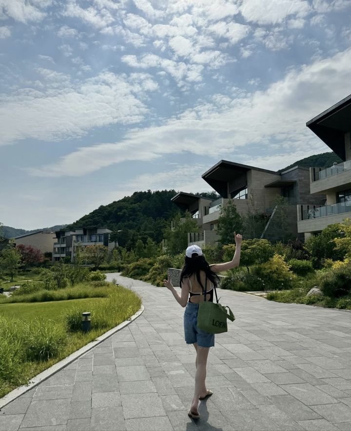 사진 속 손연재는 블랙 앤 화이트 수영복을 착용해 깔끔하면서도 세련된 이미지를 연출했다. 수영복의 모노크롬 컬러 조합은 그녀의 고급스러운 분위기를 한층 더 강조했다. 또한, 손연재는 허벅지까지 오는 청바지를 매치해 청순하고 활기찬 느낌을 자아냈다. 자연스러운 포즈와 밝은 미소는 그녀의 발랄한 매력을 더해준다.