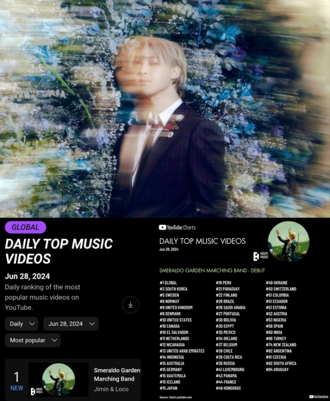 방탄소년단(BTS) 멤버 지민의 솔로 2집 선공개 곡 '스메랄도 가든 마칭 밴드(Smeraldo Garden Marching Band ft. loco)'가 세계적인 인기를 얻고 있다.