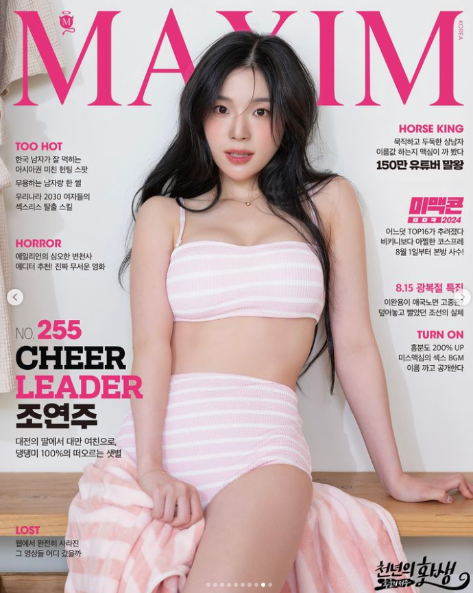 조연주 치어리더는 최근 본인의 소셜네트워크서비스(SNS)를 통해 "맥심 8월호 ‘조연주’ 편이 나왔어요! 많이 기대해주세용"이라는 글과 함께 여러 장의 사진 및 영상을 게시했다.