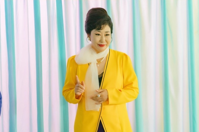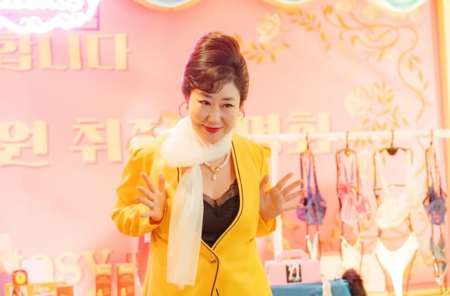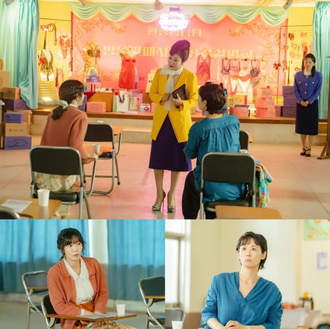 공개된 스틸컷에는 김미란이 방문 판매 취직 설명회장에서 당당한 자태를 뽐내는 모습이 담겼다. 성공한 사업가로서의 자신감이 물씬 풍기며, '리치 씨스터'의 롤모델로 자리 잡은 그녀의 캐릭터를 완벽하게 소화한 장면이다.