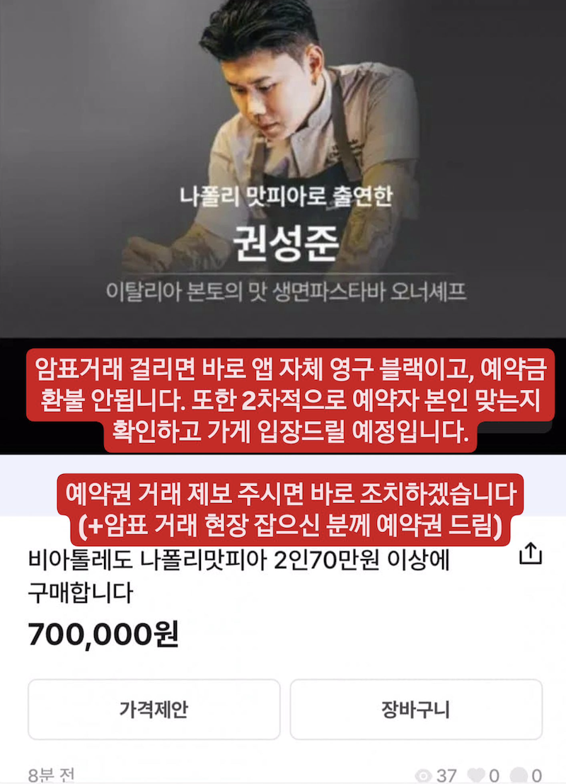 또한 암표 거래에 대해서는 "암표 거래가 적발되면 앱에서 영구 블랙 처리되며, 예약금도 환불되지 않는다"며 "예약자 본인 여부를 확인하고 가게 입장을 허용할 예정이다. 암표 거래 제보가 들어오면 즉시 조치할 것"이라고 강경한 입장을 밝혔다.