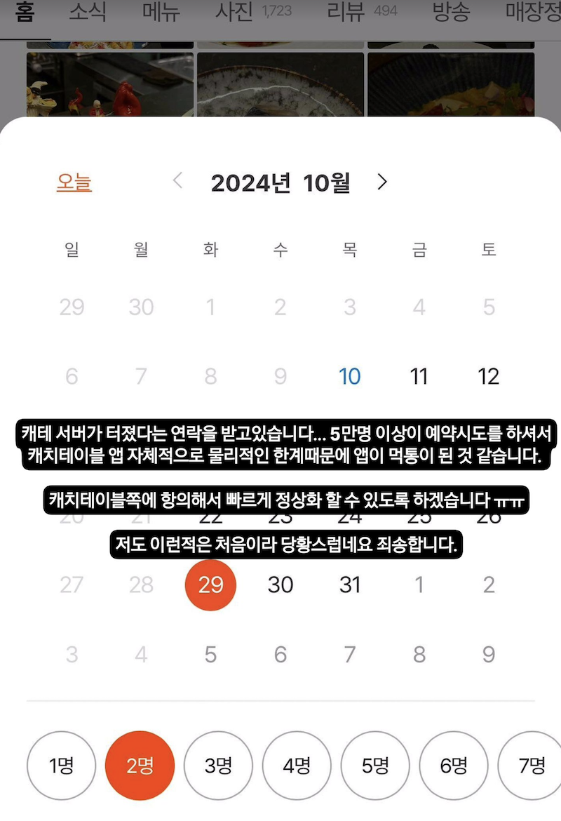 10일 예약 플랫폼 캐치테이블에 따르면, 이날 오전 10시부터 권성준 셰프가 운영하는 ‘비아톨레도 파스타바’의 예약을 시도한 이용자가 11만 명을 넘어서며 약 20분간 접속 장애가 발생했다. 일부 이용자는 10시가 되자마자 로그아웃되거나 로그인 인증 오류를 겪는 등 불편을 호소했다.