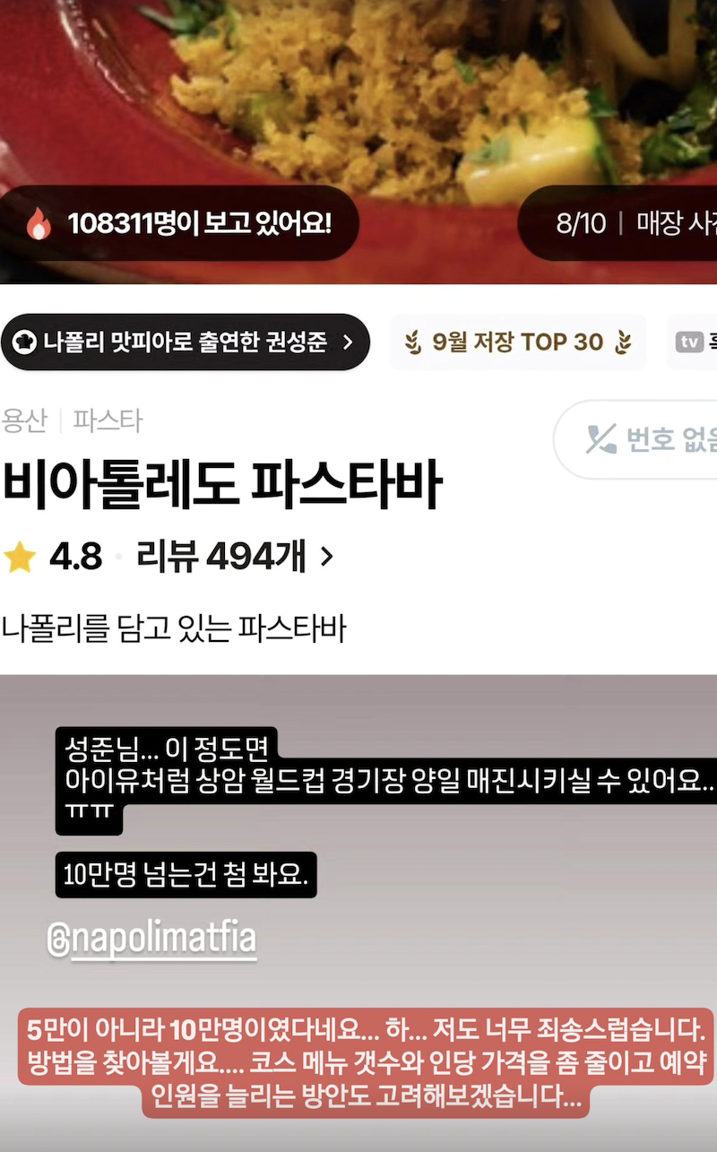 현재 '비아톨레도 파스타바'의 10월 예약은 모두 마감된 상태이며, '빈자리 알림 신청'을 한 인원도 100명을 초과한 것으로 알려졌다.