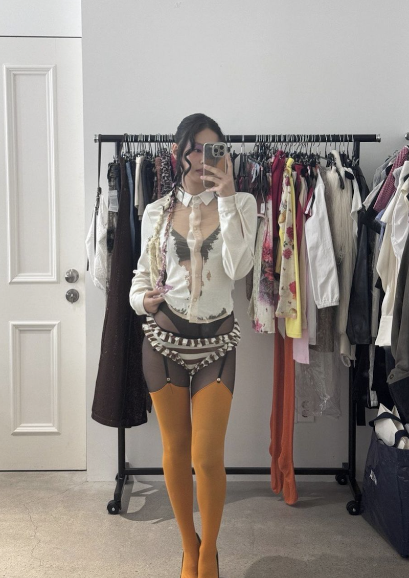 공개된 사진 속에서 제니는 체크무늬 상의를 앞섶만 잠근 채 밑가슴이 드러나는 '언더붑' 패션을 완벽히 소화했다. 여기에 팬티 라인이 드러나는 숏팬츠와 부츠 힐을 매치해 섹시한 매력을 한층 더 강조했다.
