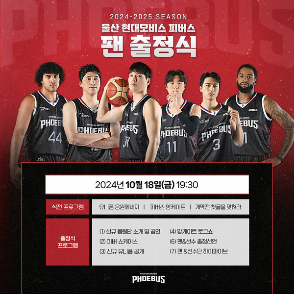 이번 팬 출정식은 행사 시작 30분 전인 저녁 7시부터 인원 제한 없이 현대모비스 팬이라면 누구나 입장이 가능하다. 조동현 감독과 코칭스태프, 주장 장재석과 외국인 선수들을 포함한 선수단 전원이 참석한다.