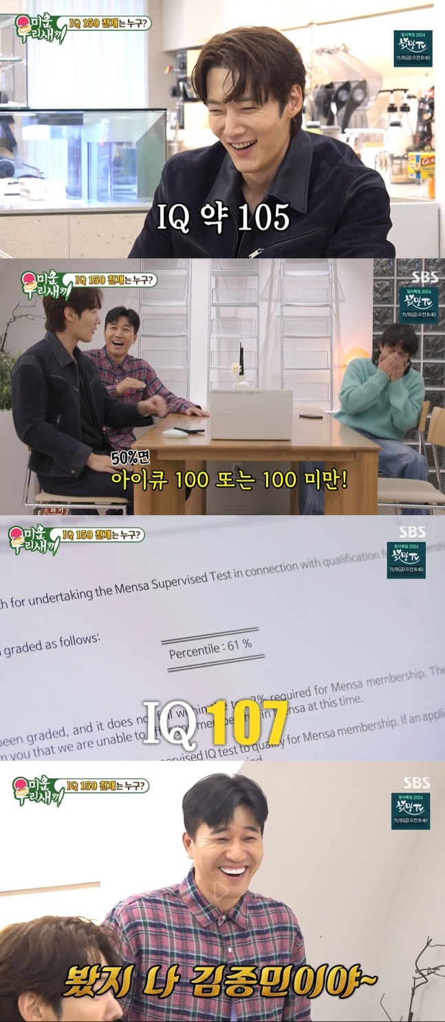 3일 방송된 SBS 예능 프로그램 '미운 우리 새끼(이하 '미우새')' 416회에서는 김종민, 최진혁, 은지원이 상위 2%, IQ 148 이상만 가입 가능한 멘사 테스트에 도전하는 장면이 그려졌다.