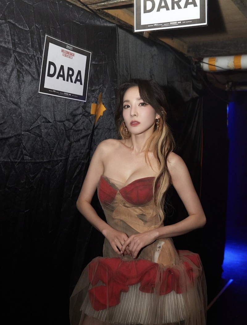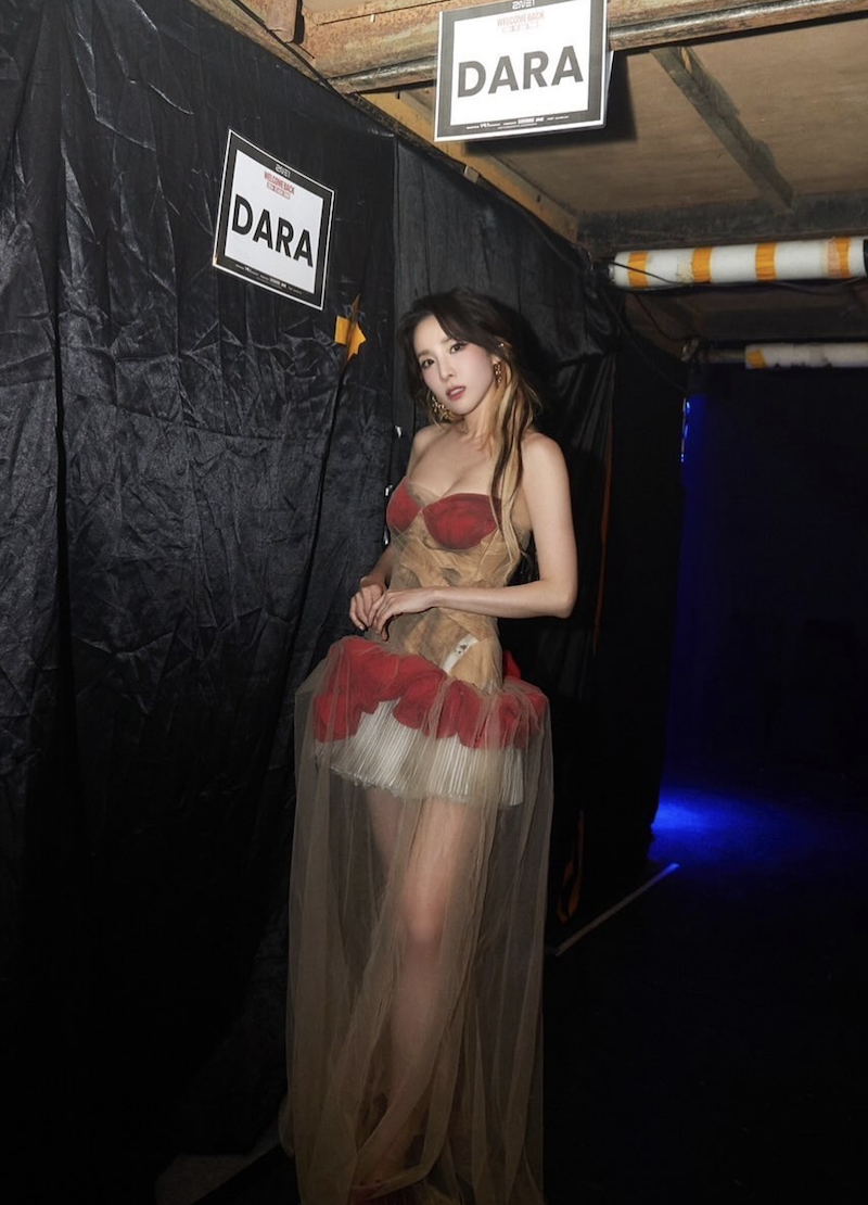 안무가 배윤정은 산다라박의 SNS 게시물에 “헐!!!!♥♥♥♥”라는 댓글을 남기며 그녀의 매력에 감탄을 표했다. 또한 드레스 아래 플리츠 디테일이 더해져 다리가 길어 보이는 효과를 주었고, 얇은 튤 소재가 무대 조명 아래에서 그녀의 아름다움을 더욱 돋보이게 했다.