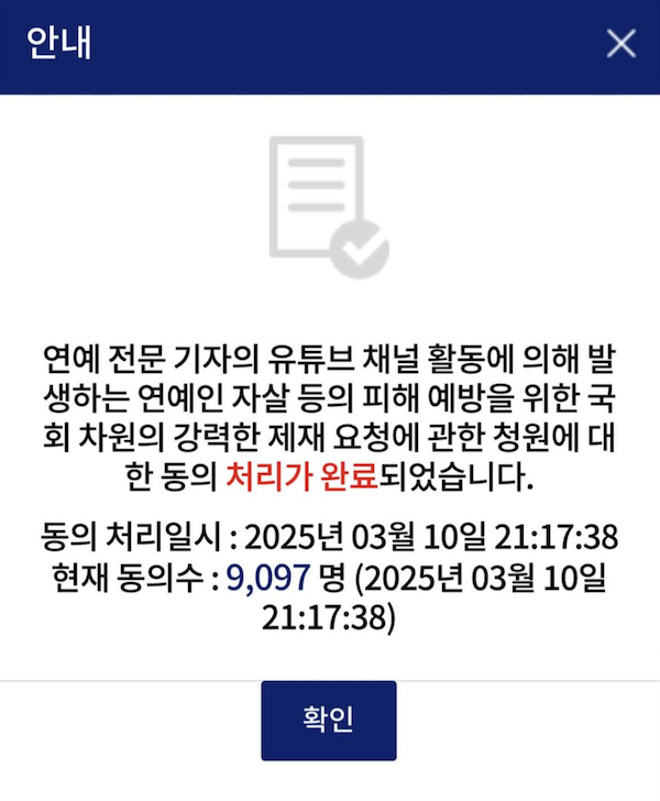 이 청원은 배우 故 김새론의 사망 이후 지난달 등록됐으며, 연예부 기자 출신 유튜버들의 사생활 폭로로 인해 연예인들이 피해를 입고 있는 상황을 규탄하는 내용을 담고 있다. 청원에서는 “유튜버들의 기초 자격 조건을 정립하고, 이들이 전파하는 영상과 콘텐츠에 대한 규정을 마련해 기존 대중매체 수준의 기준을 적용해야 한다”고 촉구하고 있다.